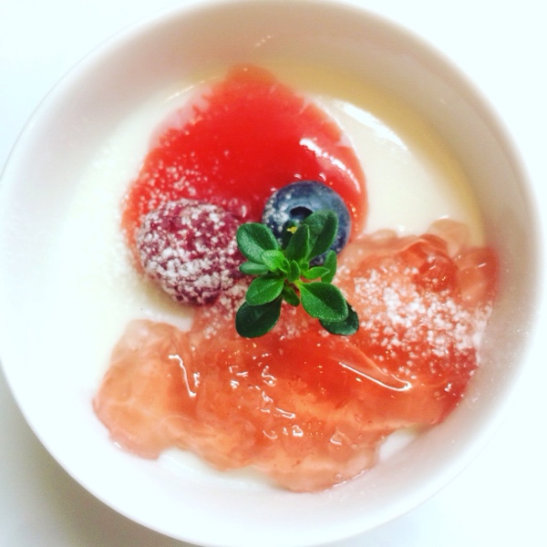 lemon mousse with blood orange jelly, with Arbequina olive oil ice cream