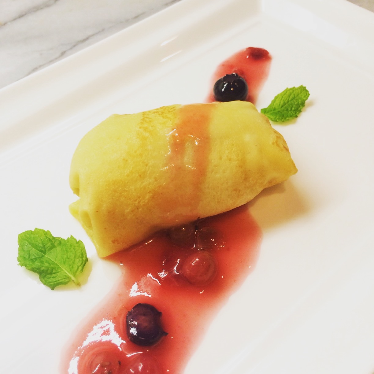 「桃のクレープ包み ベリーと白ワインのソースと共に」