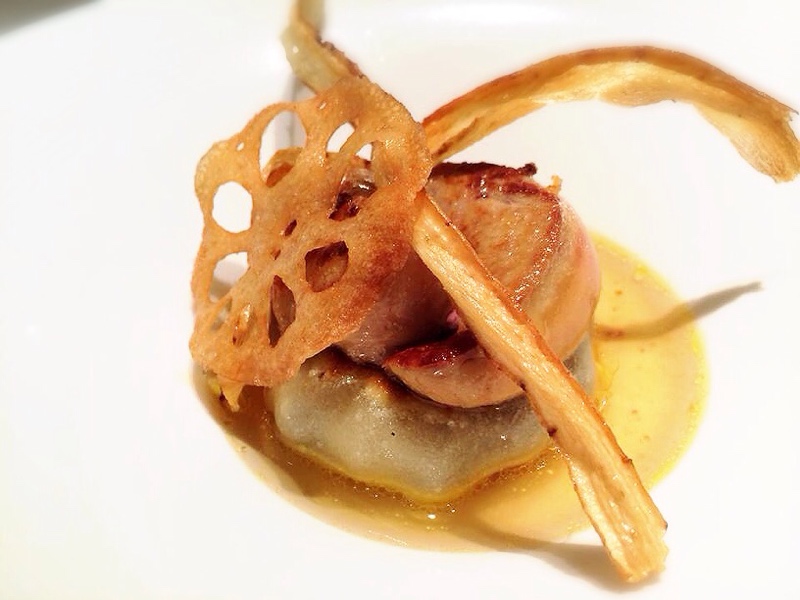 -フォアグラのポワレ 信州キノコと松の実のおやき添え 鴨とカツオのコンソメを注いで
